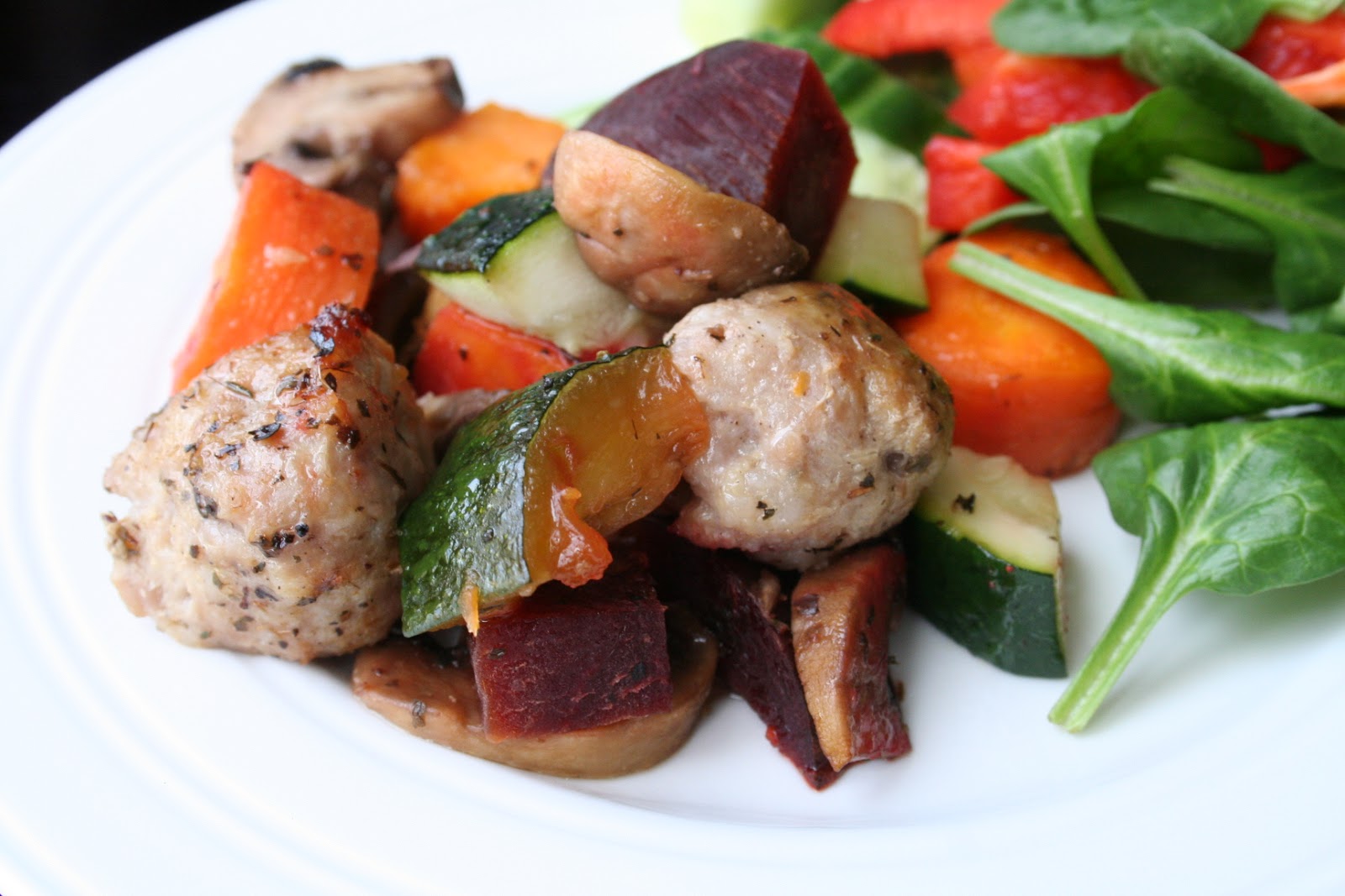 - Place all prepared vegetables and sausage into a 9 x 12 baking dish.